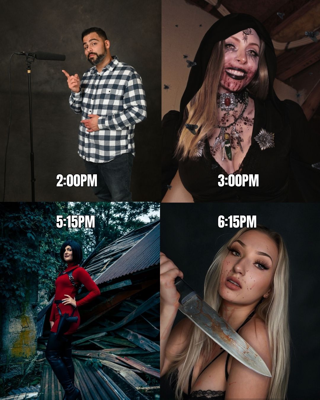 Angel Rose (Top Left): A powerhouse in the cosplay community with 8 years of experience as a published cosplayer and reputation for delivering unforgettable horror focused panels.